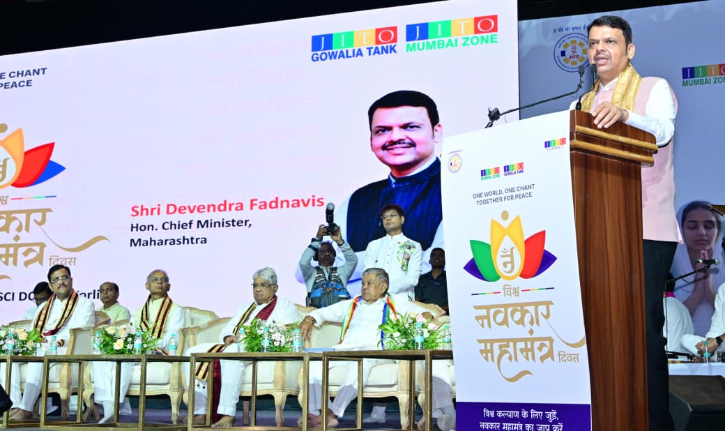 जैन इंटरनॅशनल ट्रेड ऑर्गनायझेशनतर्फे आयोजित ‘विश्व नवकार महामंत्र दिवस’ कार्यक्रम वरळी येथील एनएससीआय डोम येथे पार पडला. यावेळी मुख्यमंत्री फडणवीस बोलत होते. कार्यक्रमास आचार्य परम सागर महाराज, निरंजन सागर महाराज, सौम्य सागर महाराज, मानव कोठारी, भगवत कोठारी, आशिष शहा यांची उपस्थिती होती.
